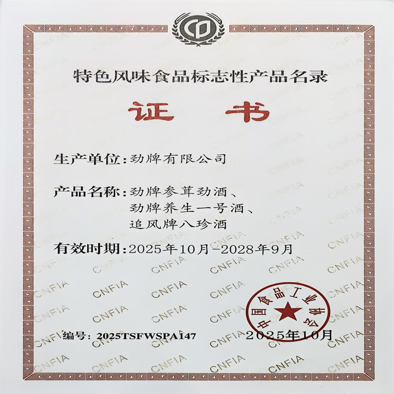 近日,經中國食品工業協會組織專家嚴格評審,勁牌有限公司旗下“參茸勁酒、養生一號、追風八珍酒”三款產品...